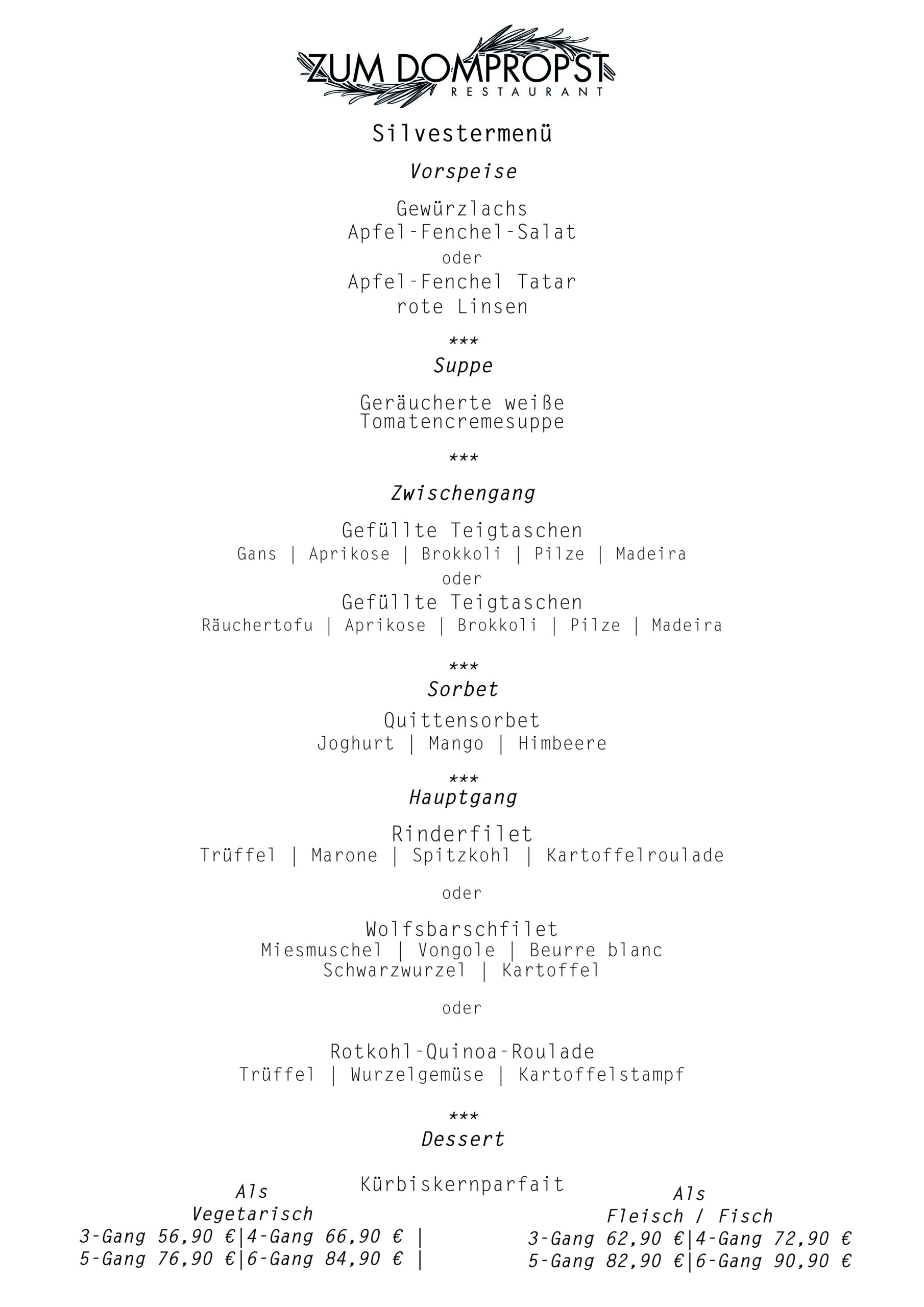 Kommen Sie vorbei und erleben Sie ein unvergessliches kulinarisches Erlebnis, während Sie gemeinsam mit uns in das neue Jahr feiern! Wir freuen uns auf Ihren Besuch und darauf, Sie bei uns im Restaurant Zum Dompropst willkommen zu heißen